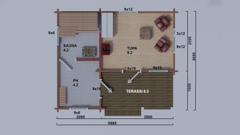 Sauna, pukuhuone, erillinen tupa ja terassi. Moderni malli johon tuvan isot ikkunat luo tilan tuntua!