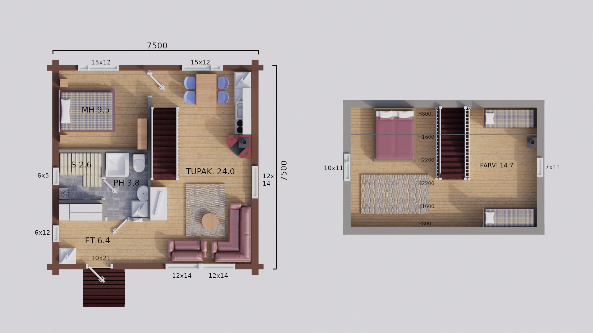 Iso tupa, makuuhuone, saunatilat ja tilava parvi