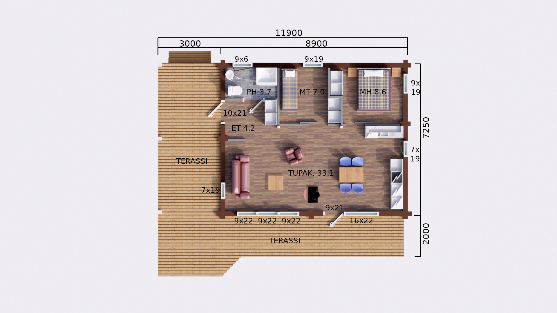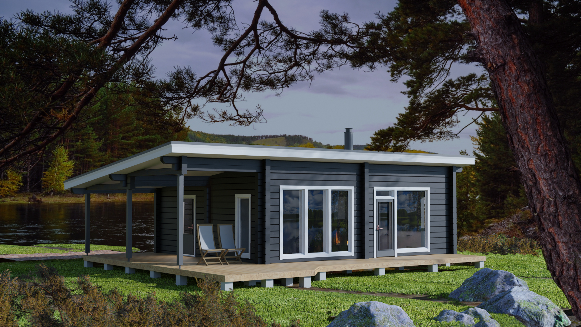 Moderni hirsihuvila jossa reilusti tilaa ja katettua terassia