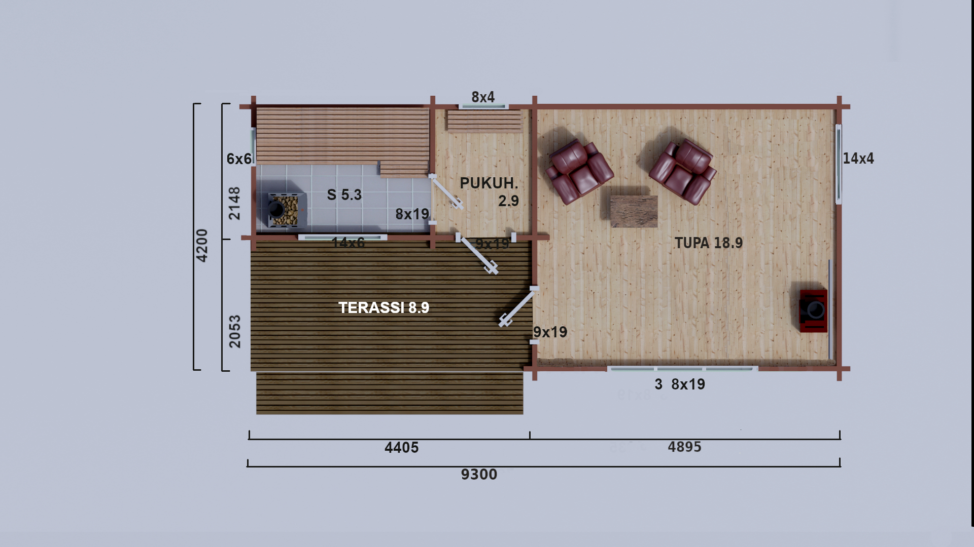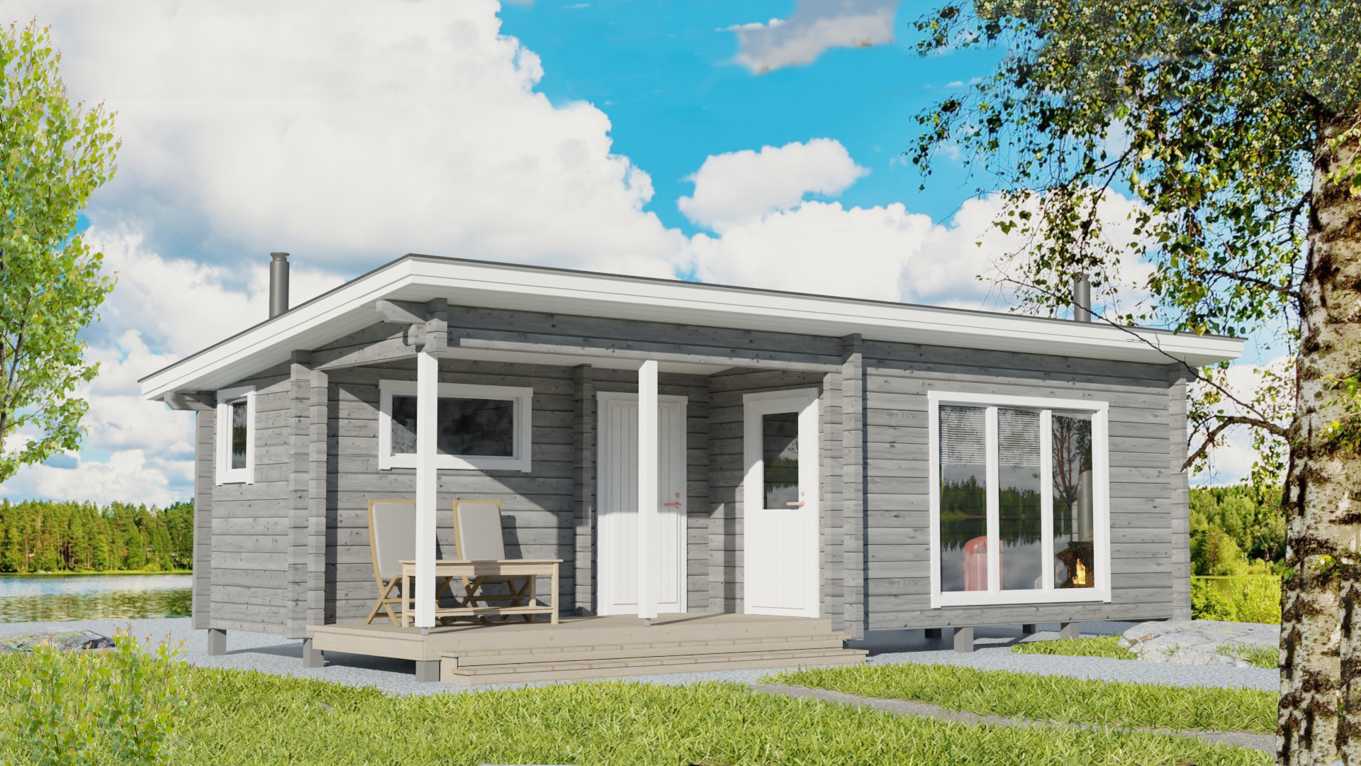 Sauna, pukuhuone, erillinen tupa ja terassi. Moderni malli tilavalla tuvalla johon isot ikkunat luovat avaruutta ja valoa!