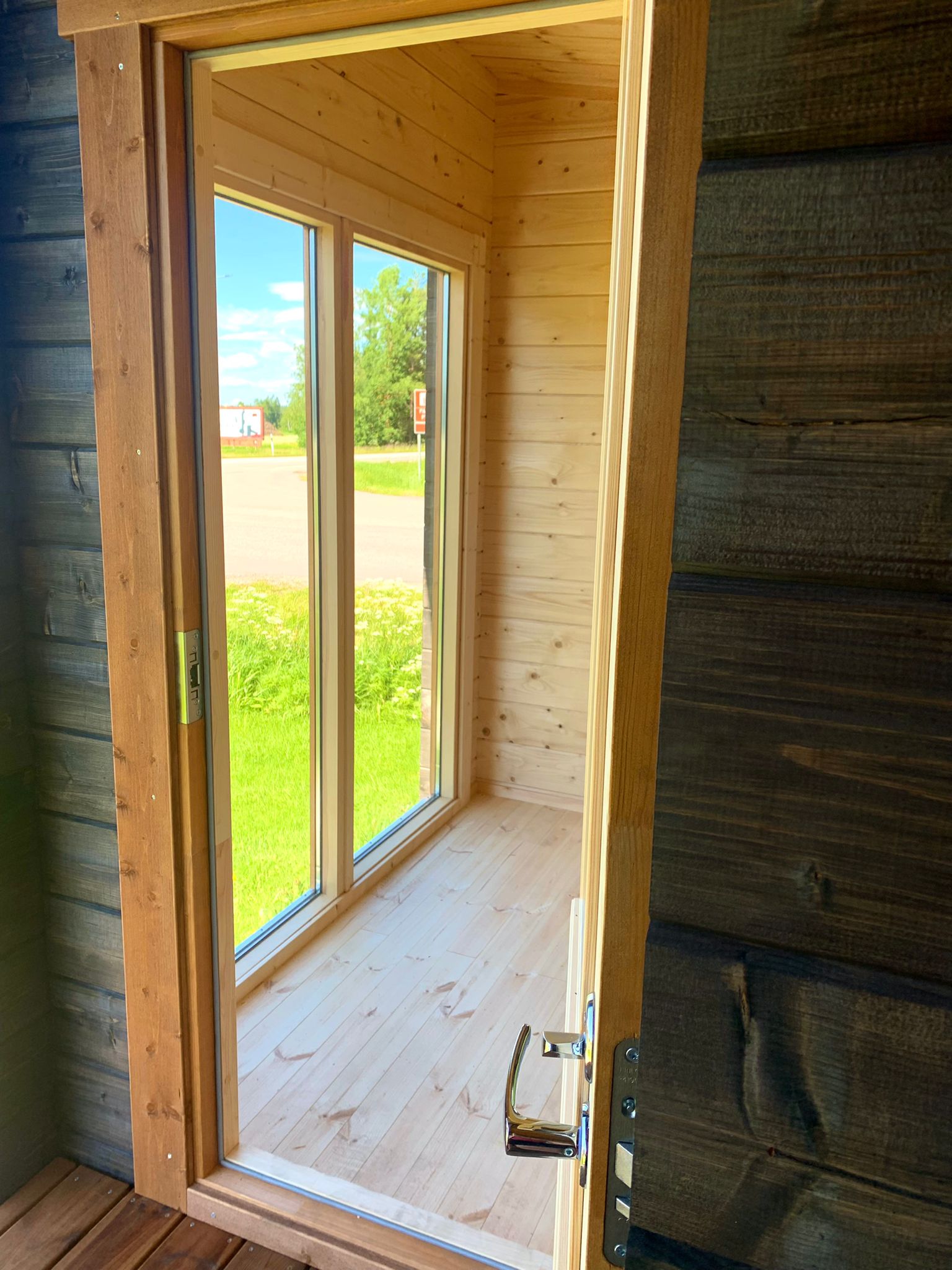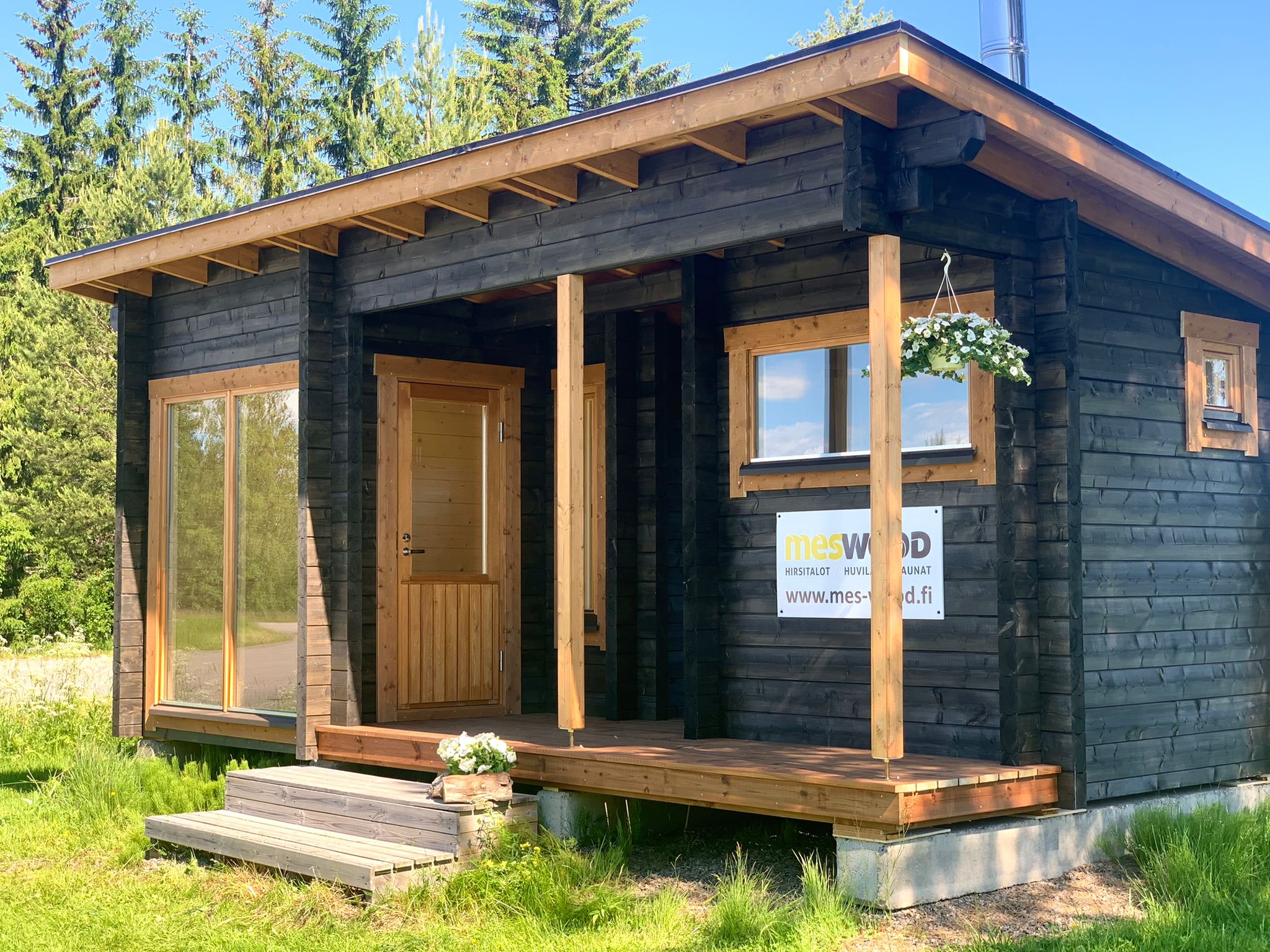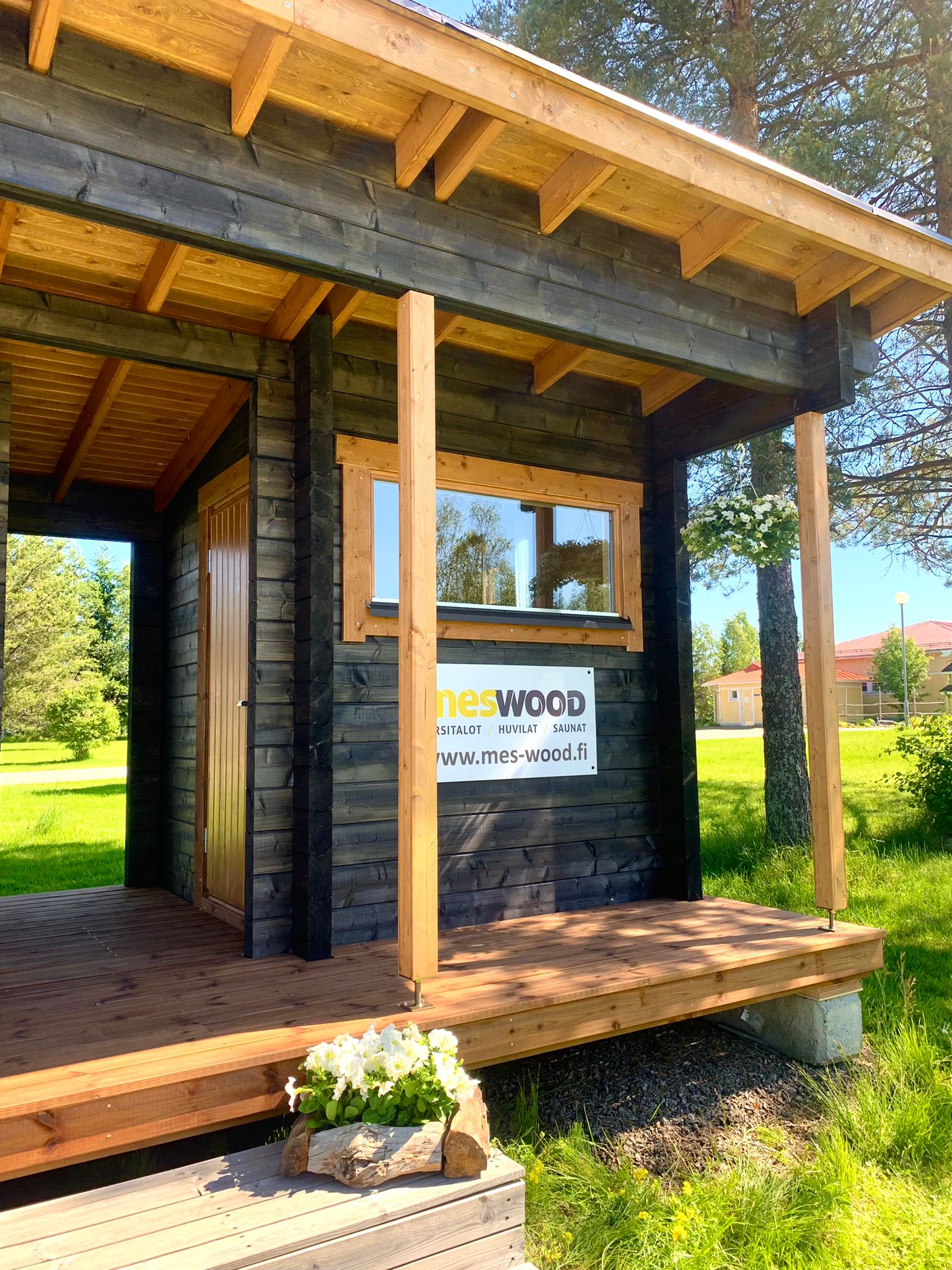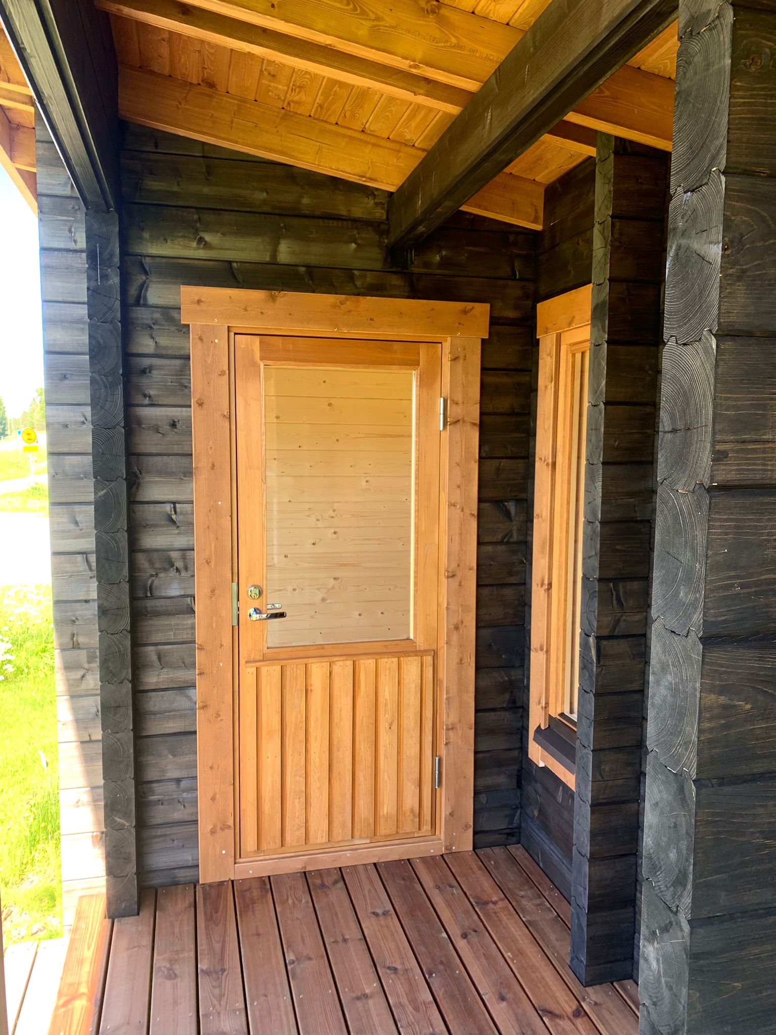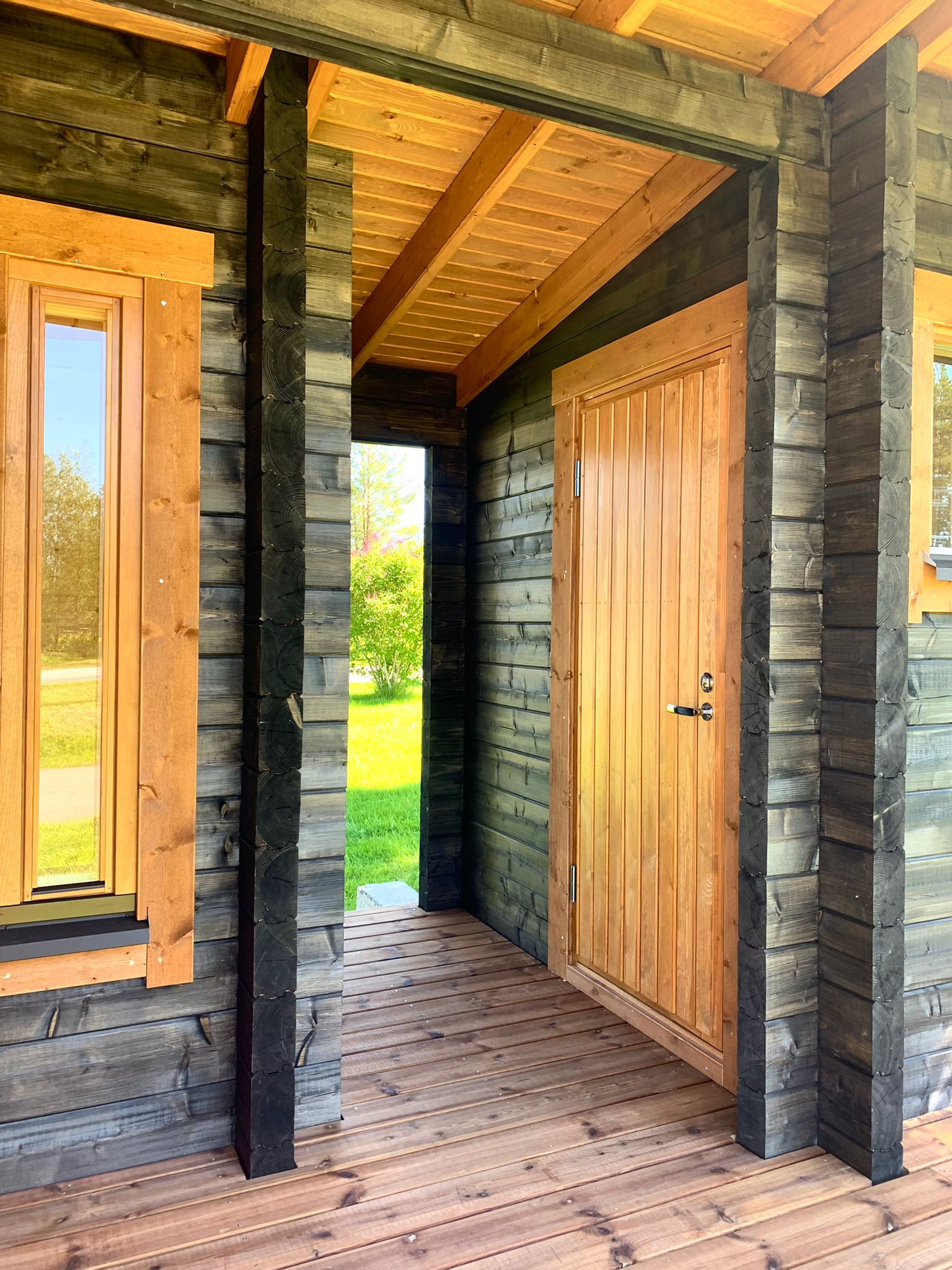 Sauna, erillinen tupa ja terassi. Moderni malli jonka saunan lämmöstä voi katsella maisemia moneen suuntaan.