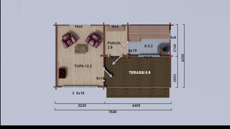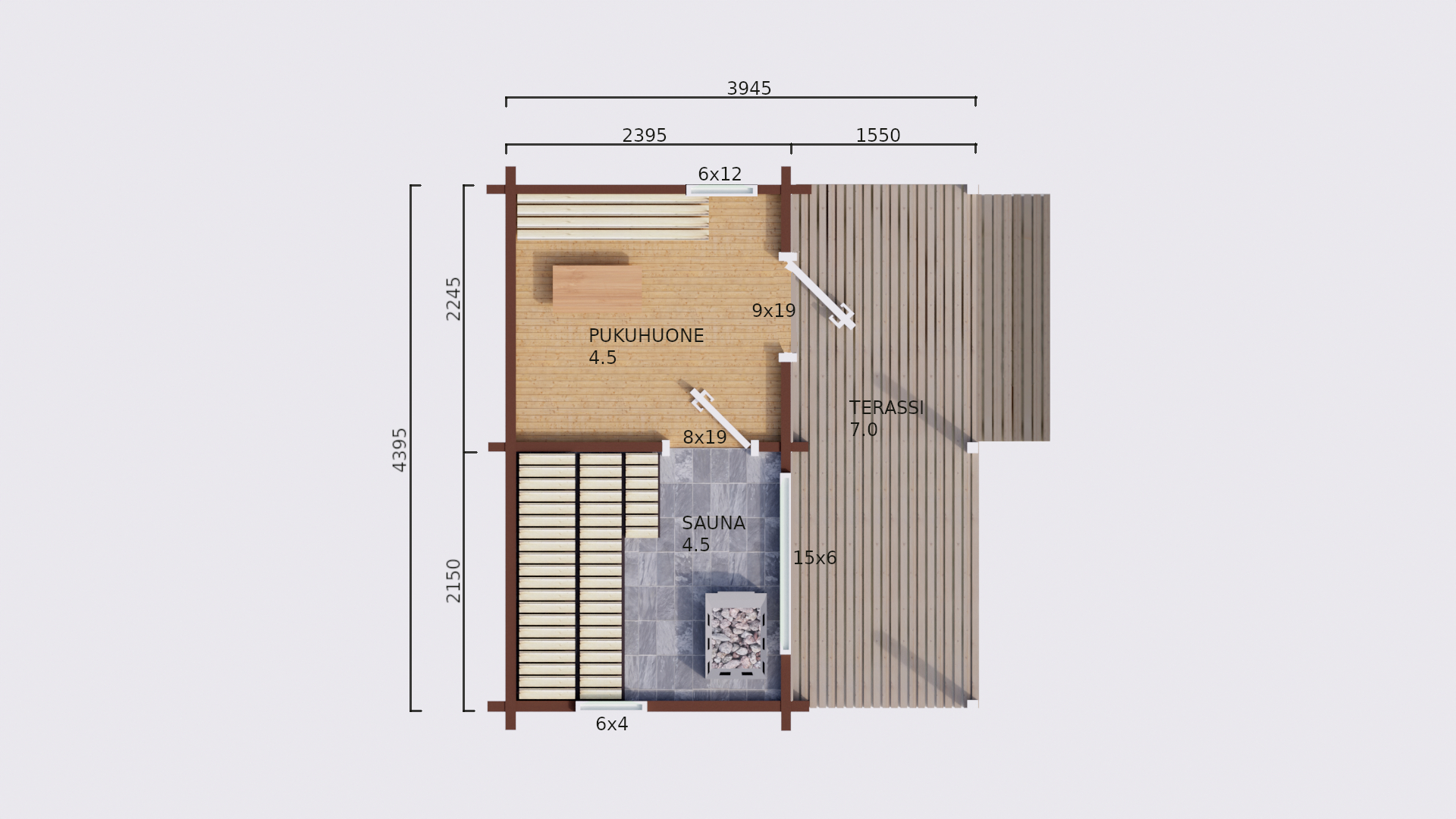 Tuvassa on runsaasti tilaa, jossa voit rentoutua ystävien tai perheen kanssa. Voit viettää aikaa yhdessä, nauttia hyvästä seurasta ja luoda unohtumattomia muistoja. Kerrosala on 19 neliömetriä ja reilusti terassia, joten sinulla on tarpeeksi tilaa saunoa ja tuntea olosi mukavaksi.