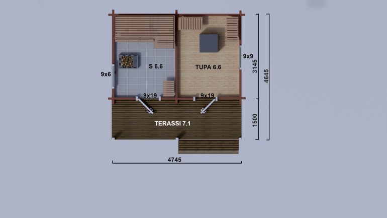 Yksihuoneinen saunatila on selkeä ja toimiva. Tilaan mahtuu reilusti löylyihin, ja harkittu pohjaratkaisu tekee saunomisesta sujuvaa ja miellyttävää. Edessä oleva kuisti tarjoaa luonnollisen paikan vilvoitella, istua hetkeksi ja antaa savun tuoksun ja lämmön tasaantua kuten ennen vanhaan.