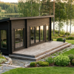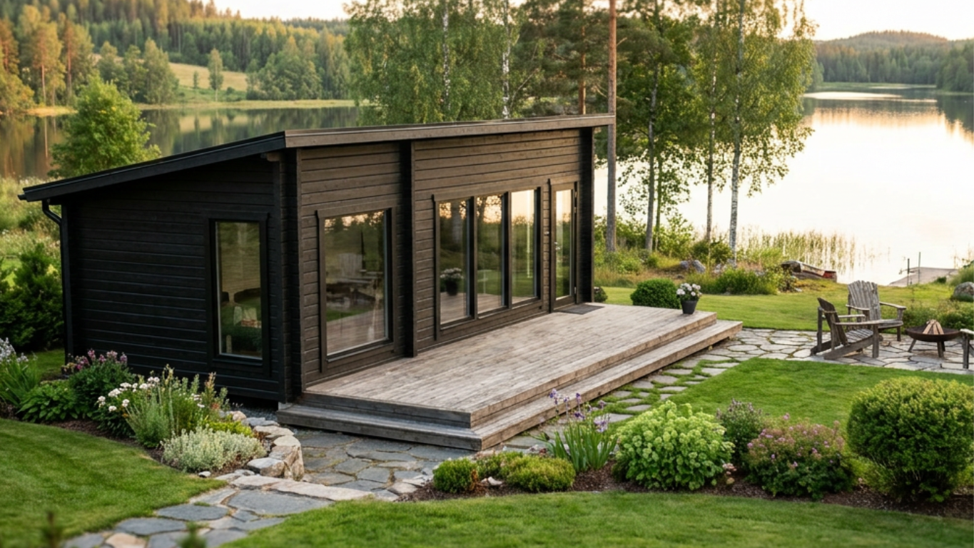 Moderni vapaa-ajan huvila jonka isoista ikkunoista halutut näkymät pääsevät oikeuksiinsa.